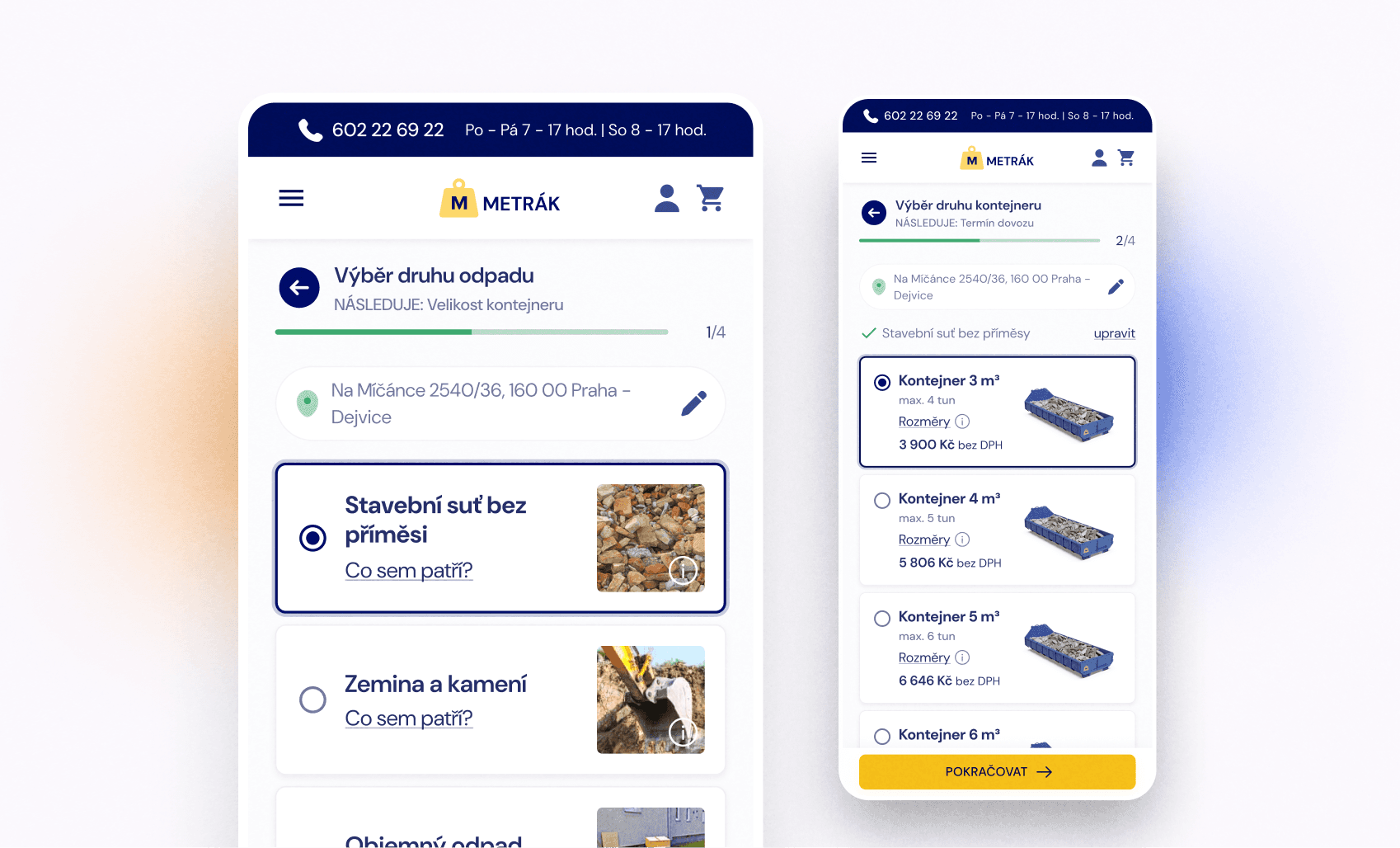 Flow som rozdelila do samostatných krokov: výber typu služby, druh odpadu alebo materiálu, objem kontajnera, adresa, termín a záverečné zhrnutie s platbou. Každý krok má vlastnú obrazovku - užívateľ sa sústredí vždy len na jednu vec.